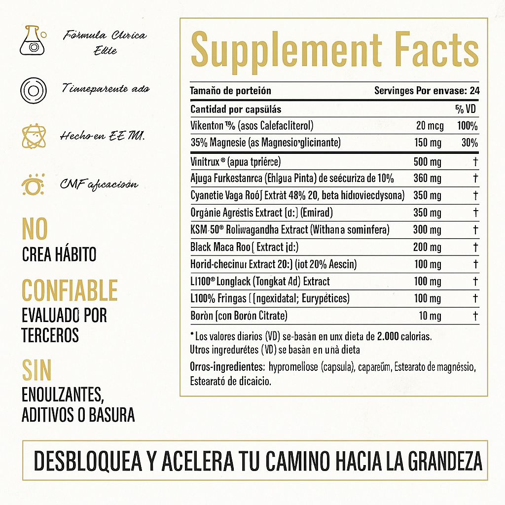 La vitamina D3 y el zinc equilibran las hormonas, mientras que la fadogia y el tongkat ali aumentan la testosterona y reducen el estrés. El boro aumenta la testosterona libre, lo que aumenta la fuerza, la energía y la confianza.